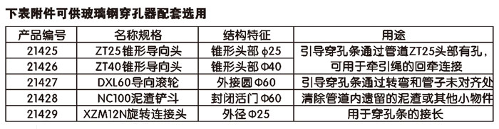 组成:玻璃钢穿孔器由穿孔条和小车组成,穿孔条两头各有M12螺纹连接的尼龙导向头和牵引环,穿孔条的标准长度为100m。