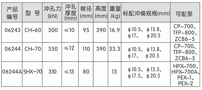 • 用于铜铝排及低碳钢材冲孔,需另配购手动泵或电动泵。