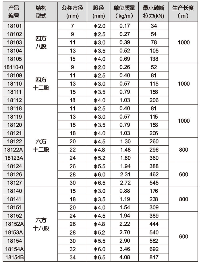 • 本表规格破断力为采用1960MPa强度等级的镀锌钢丝绳单股编织的,如需其他强度等级的钢丝绳,请洽本公司;